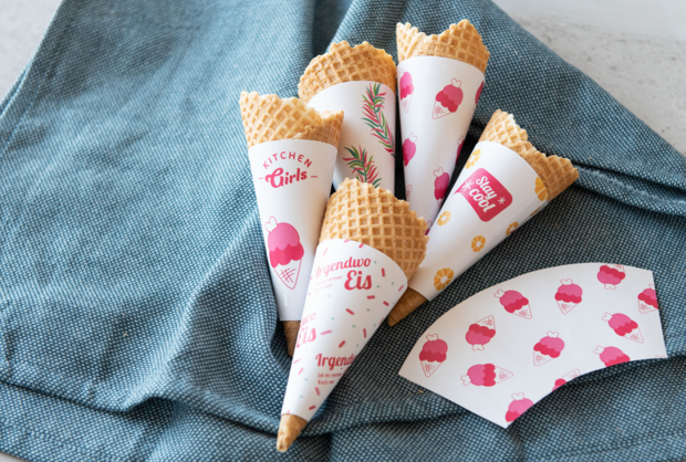 Hier kannst du dir unsere Druckvorlage für die bunten Eisbanderolen kostenlos herunterladen. Dann einfach ausdrucken, ausschneiden, um die Eiswaffeln wickeln und mit etwas Klebeband fixieren.