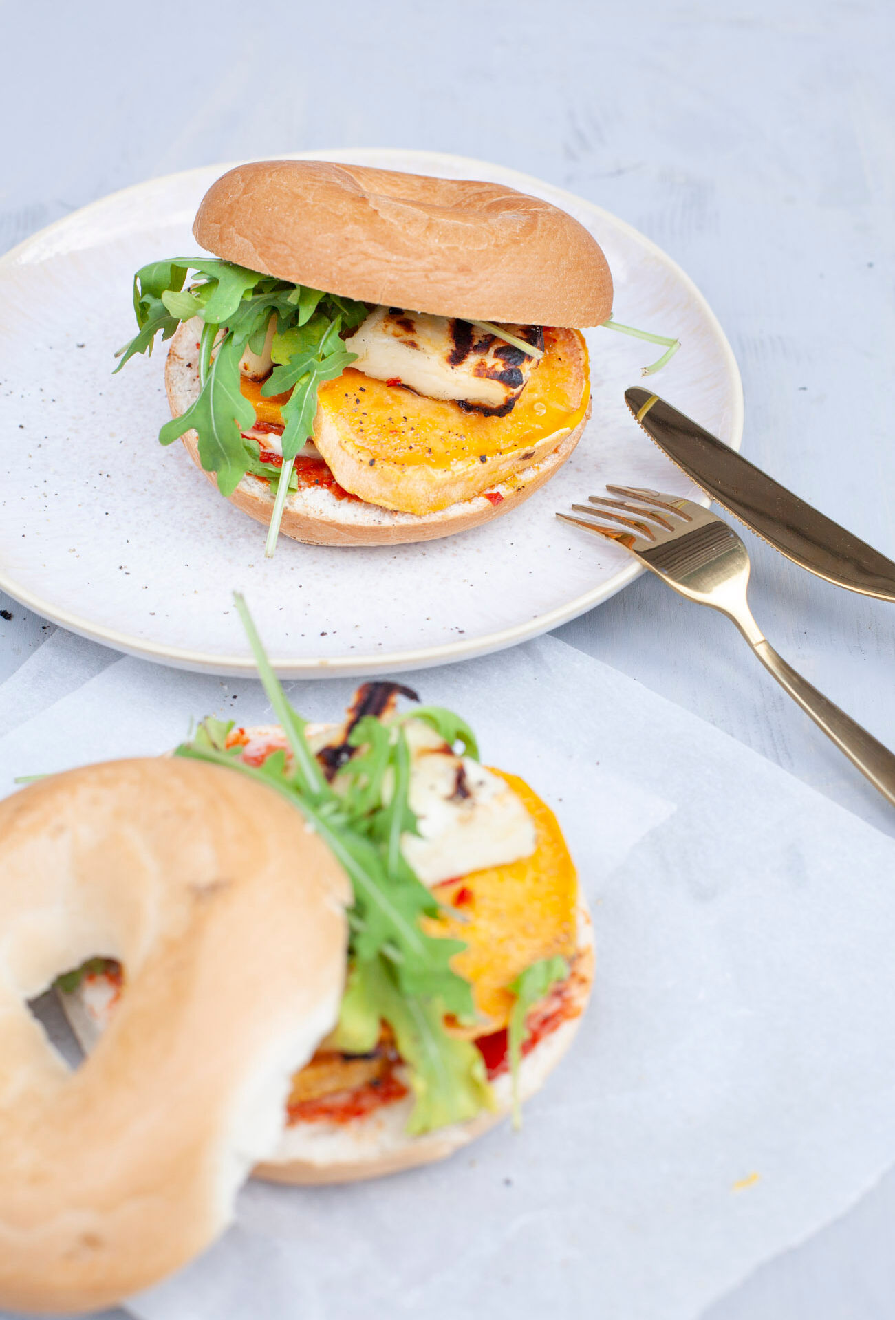 Burger vom Grill Halloumi-Süßkartoffel-Bagel-Burger